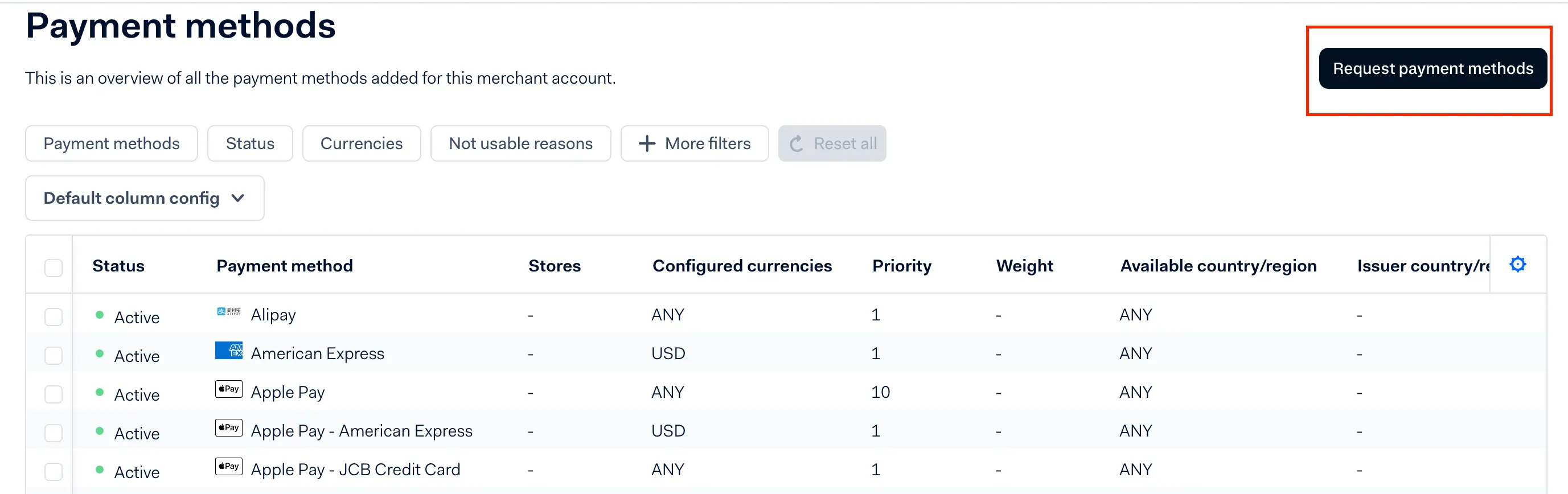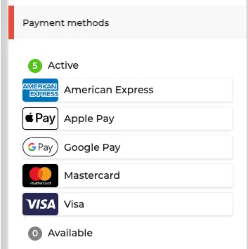 In the settings of your Merchant Contract where you earlier filled in the credentials and put other settings in place, you will see a section Payment Methods with two sub-sections: Active and Available.
