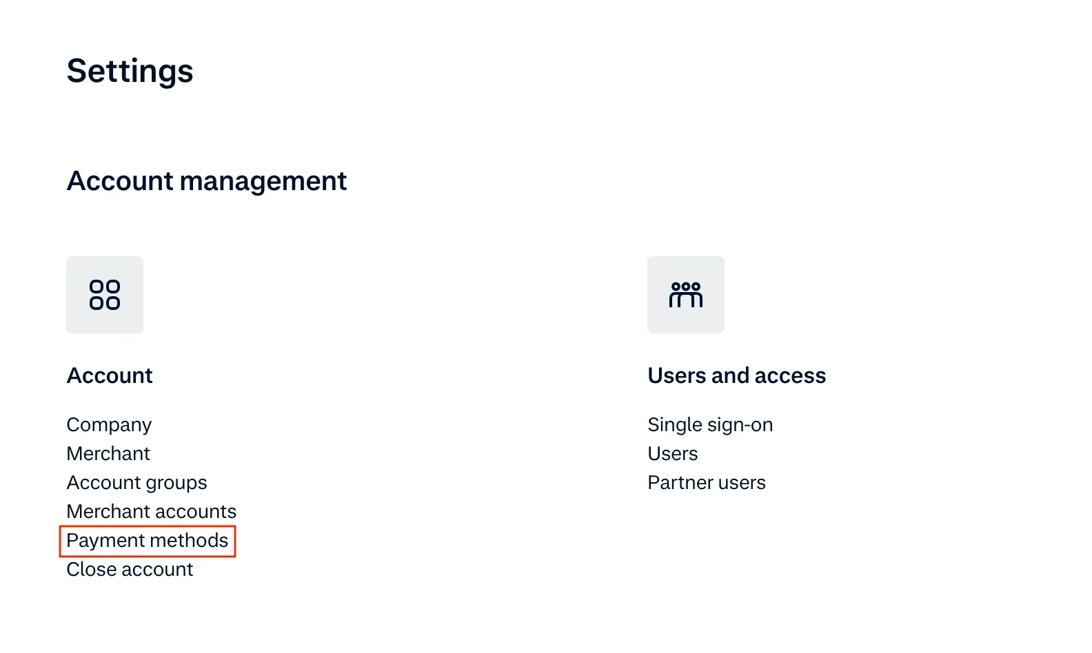 Once the merchant account is setup, select it and navigate to settings from the left side menu. Select payment methods from below Account