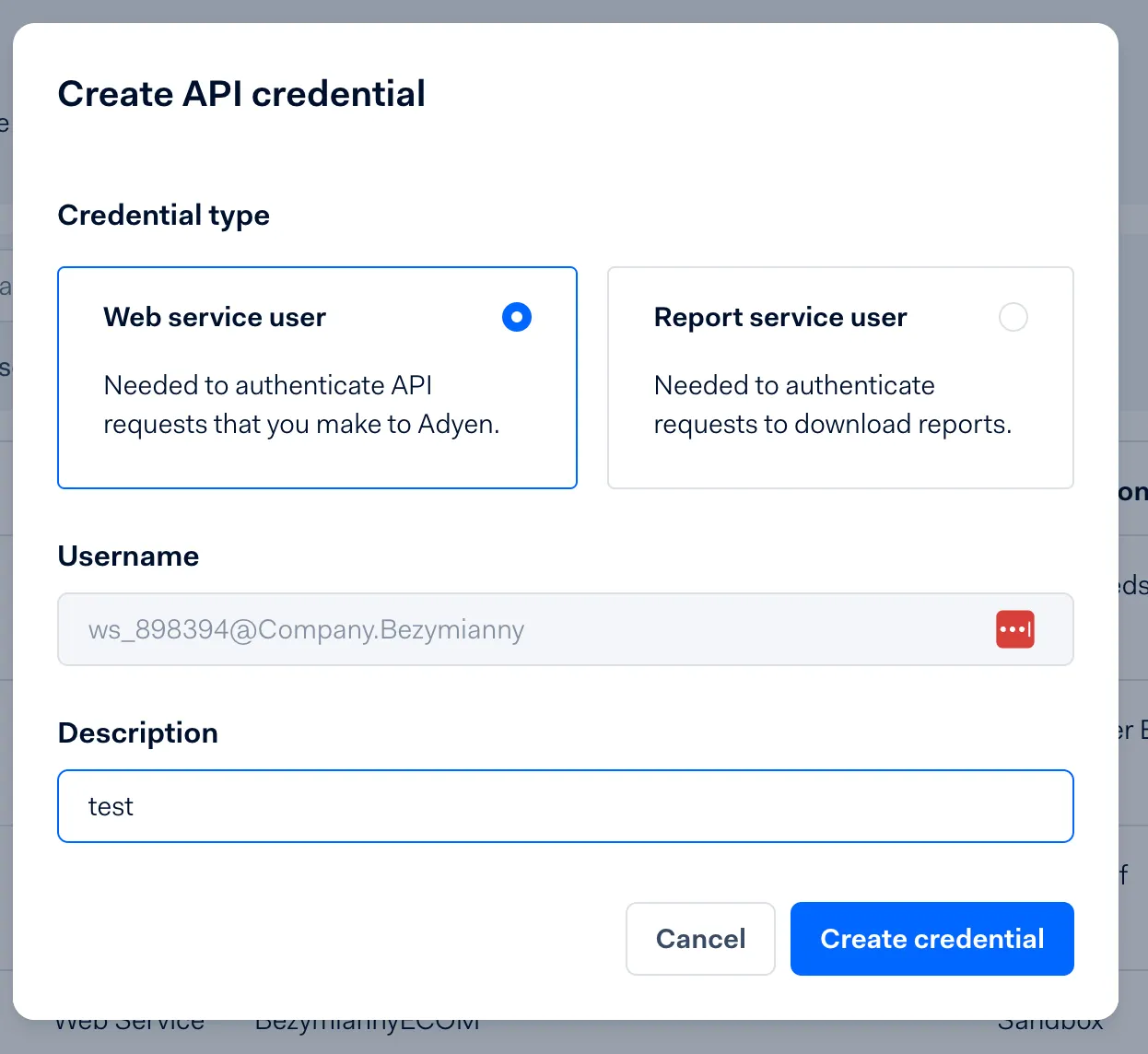 Press on the username created, if none were created already, press on “create new credentials” - select “web service user” and add a simple description for the account.