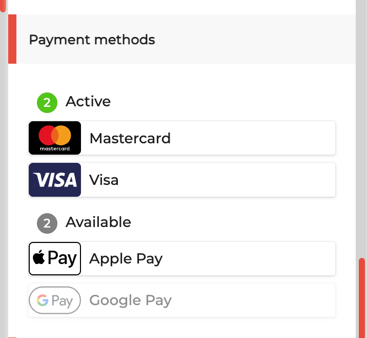 In the settings of your Merchant Contract where you earlier filled in the credentials and put other settings in place, you will see a section Payment Methods with two sub-sections: Active and Available.