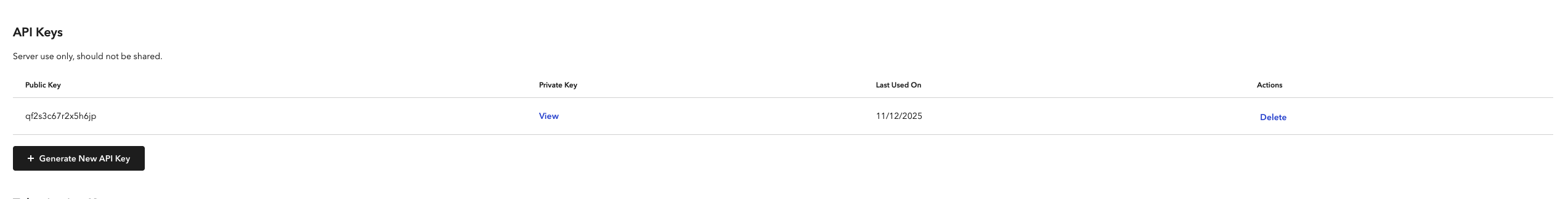You will also need the publicKey and privateKey by going to API and finding the keys under API Keys