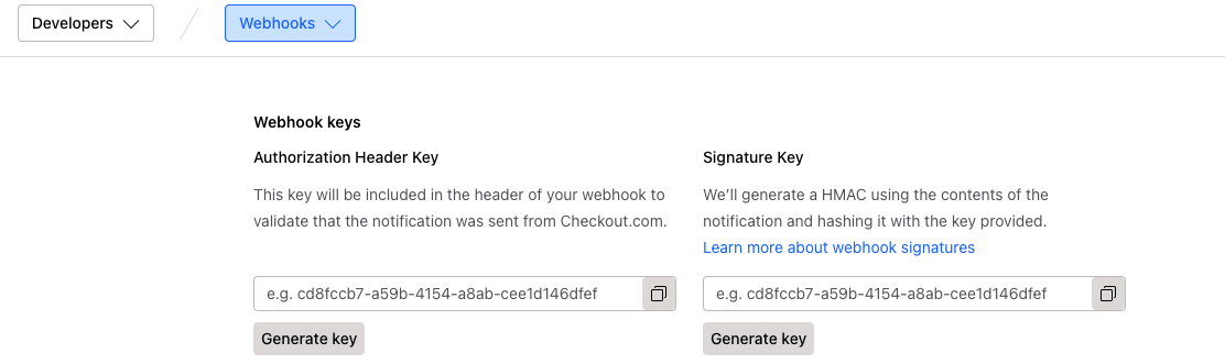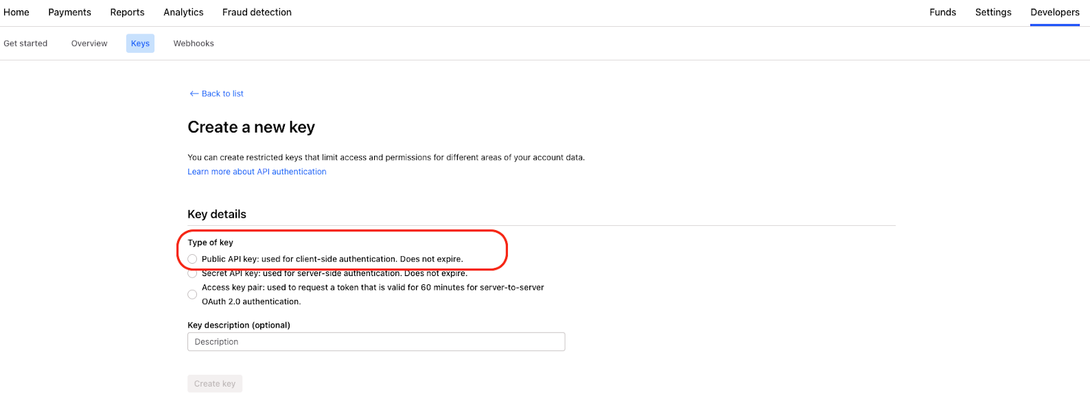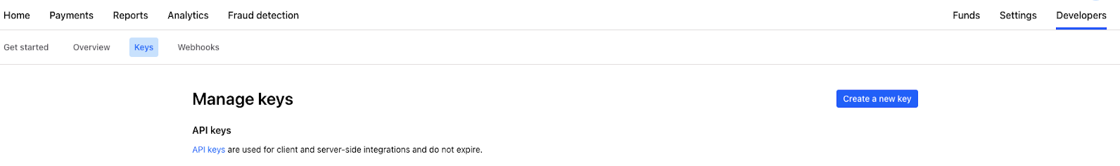 Go to Developers and → Keys or directly follow this link: https://dashboard.sandbox.checkout.com/developers/keys
