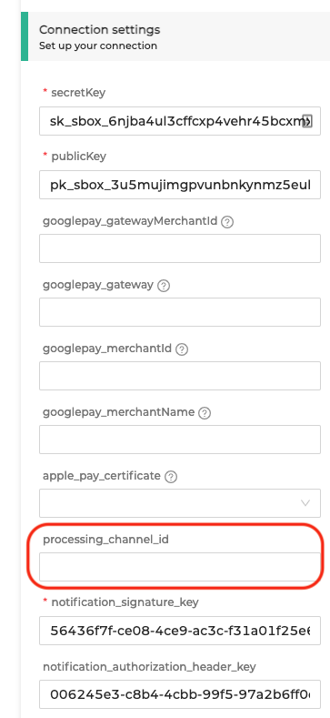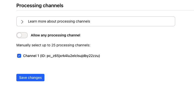 b) If you have only one processing channel: you do not have to fill the processing_channel_id as shown above out in your merchant account if you don’t select the “Allow any processing channel”, but select the channel id directly as follows: