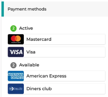In the settings of your Merchant Contract where you earlier filled in the credentials and put other settings in place, you will see a section Payment Methods with two sub-sections: Active and Available.