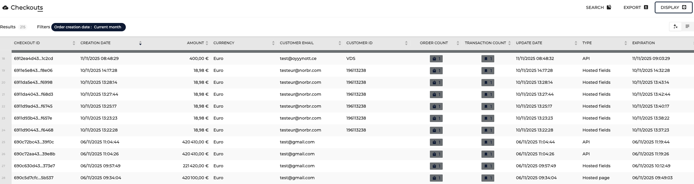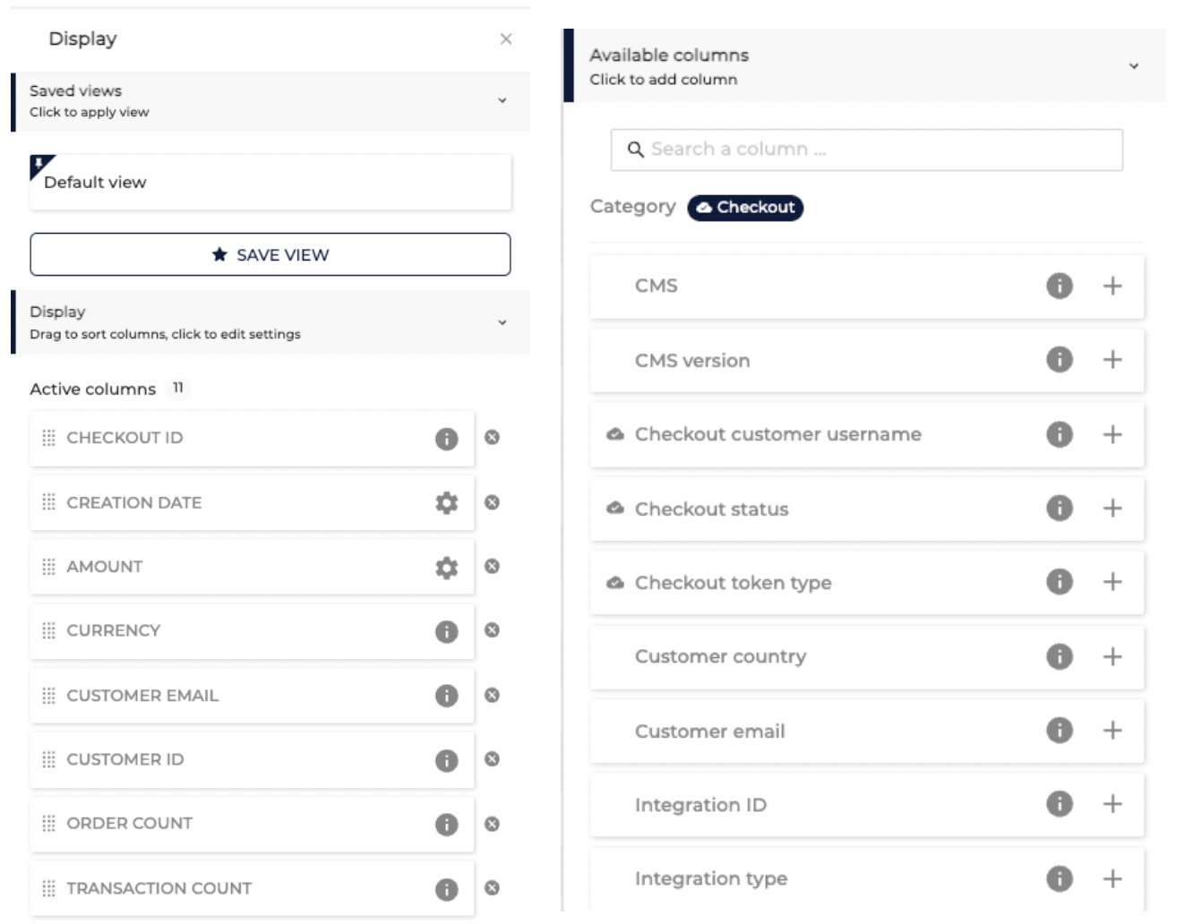 In the Checkouts section you will find all created checkouts being listed with some additional details. By default, the displayed details are: