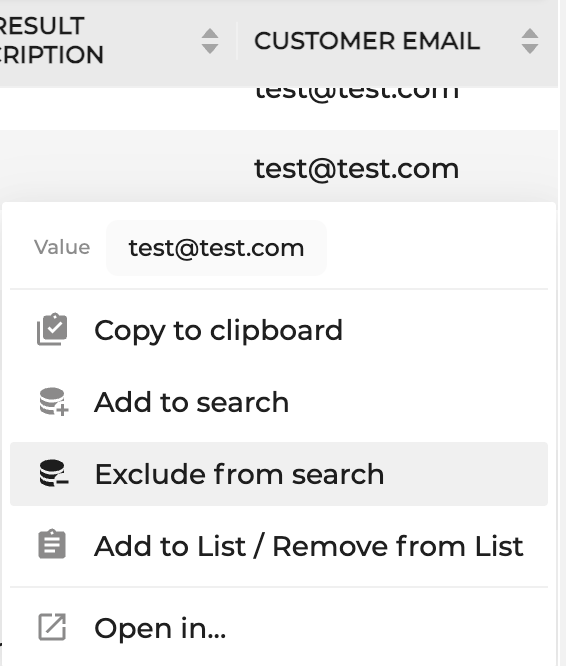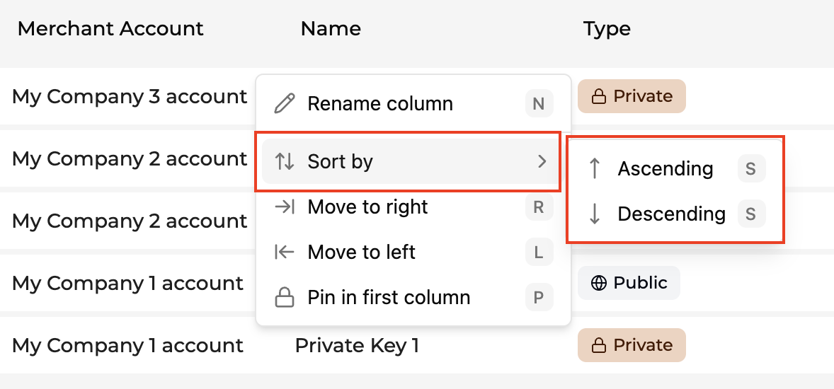 Table pages display collections of objects (for example Lists, Transactions, Orders, or Contracts). Clicking a row opens the corresponding object or record in the detail view.
