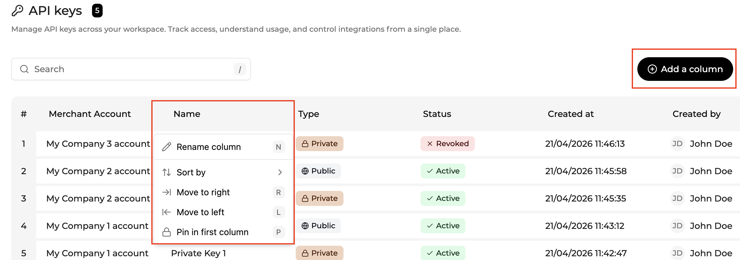 Tables can be customized using the “Add a column” feature. This allows users to control which data is displayed and how it is organized.