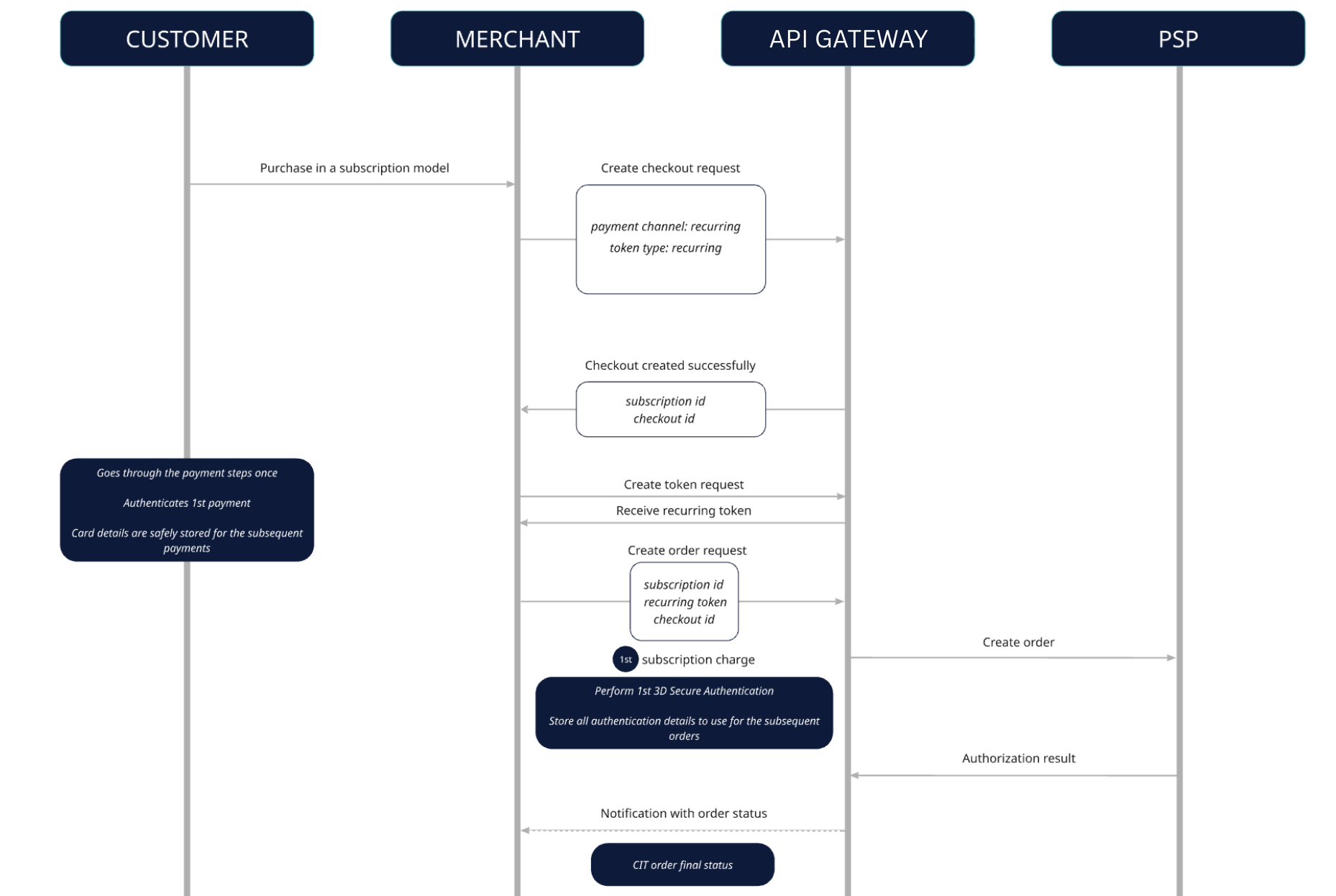 Each transaction under CIT is authorized directly by the customer, either at the start of the recurring mandate or for each transaction, depending on the regulatory framework.