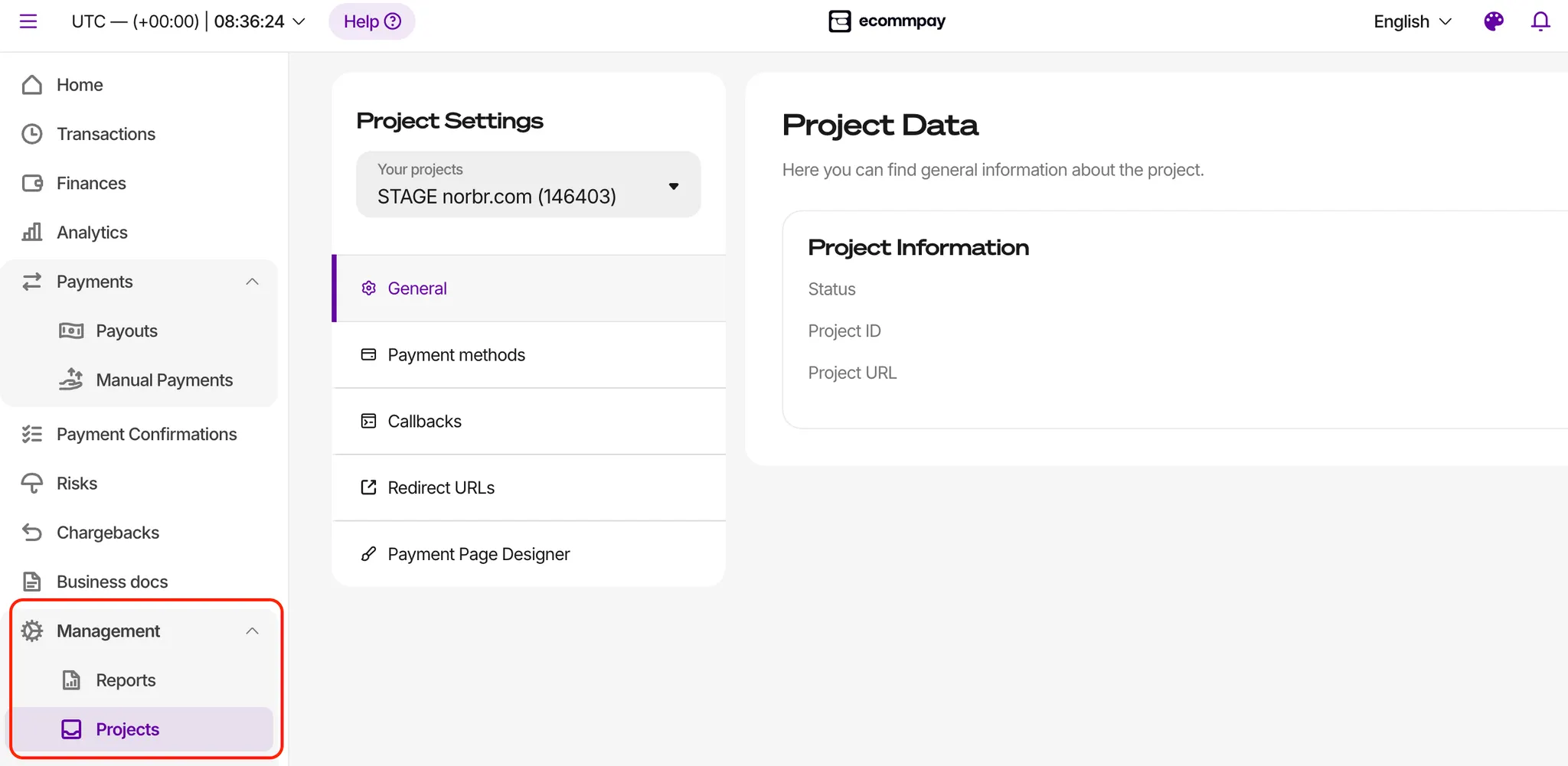 Connect to the interface : https://dashboard.ecommpay.com/ and go to the Management>Project tab, here :
