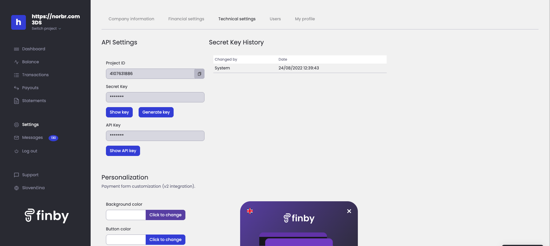 Once logged in - navigate to Settings from the left side menu and choose Technical settings from the top.