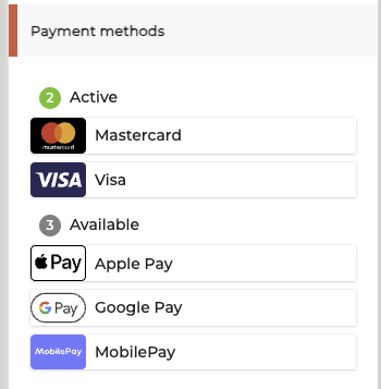 In the settings of your Merchant Contract where you earlier filled in the credentials and put other settings in place, you will see a section Payment Methods with two sub-sections: Active and Available.
