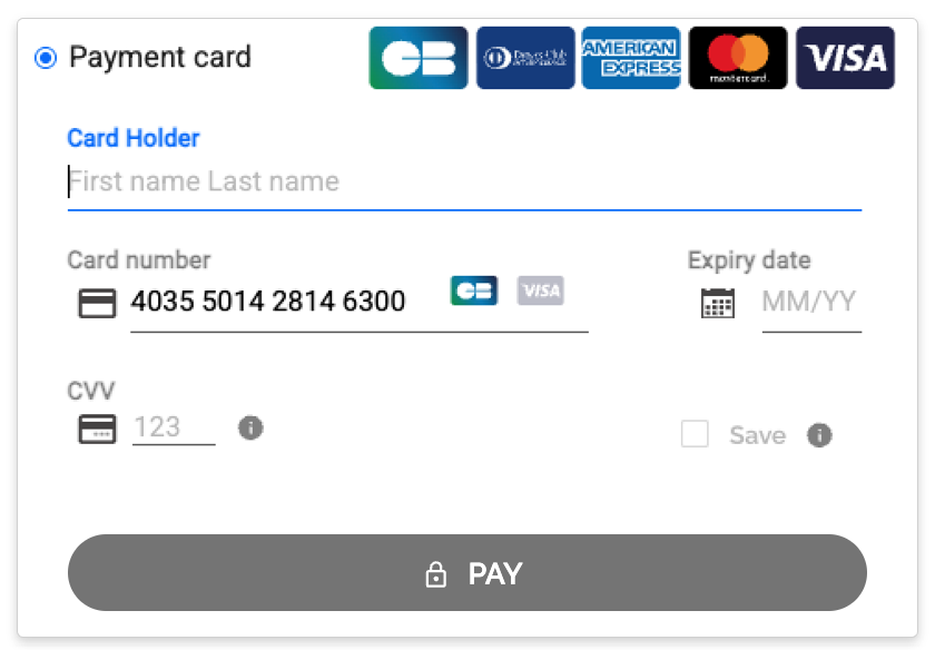 Below you can see an example of hosted elements embedded into a default payment form. When choosing this integration type, the hosted elements will be embedded into your own payment page.