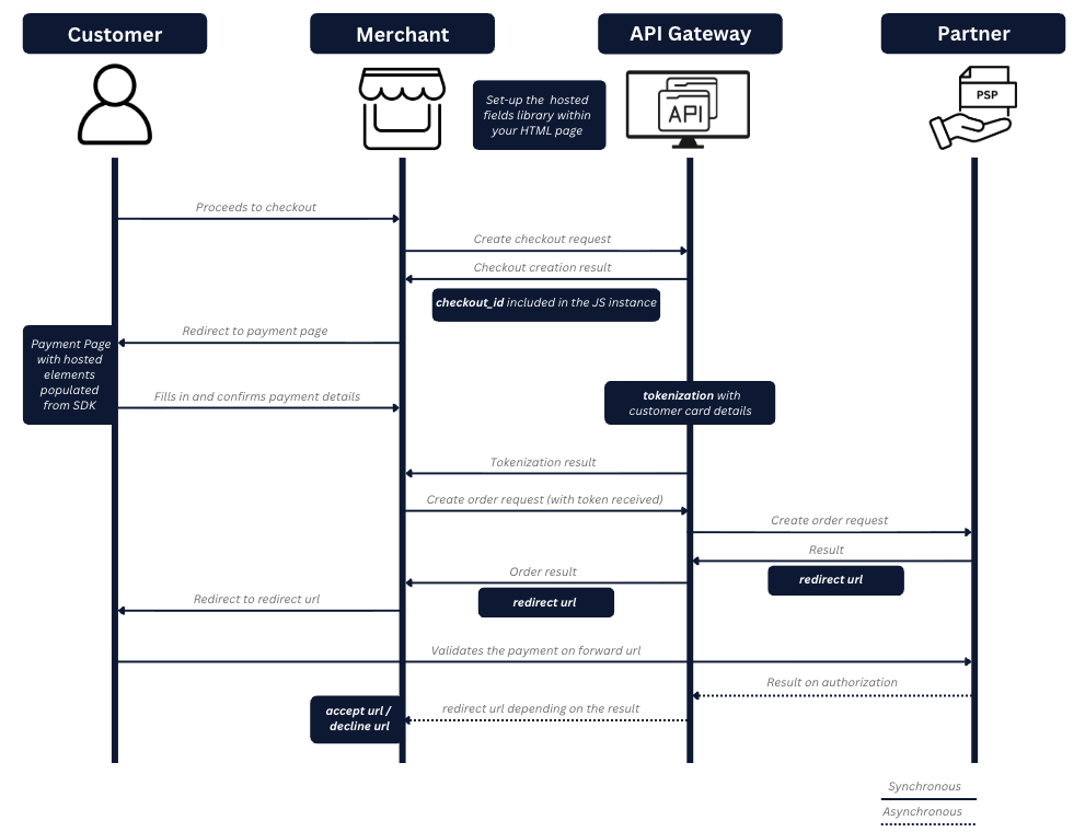 The integration works by embedding secure input fields into your checkout page. A script captures the sensitive information and sends it directly to us, ensuring that your system remains out of scope for PCI-sensitive data. This allows you to fully focus on the design and flow of your checkout, while we manage the security and compliance.
