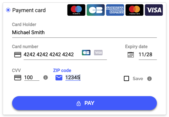 Fill in the payment details: card holder name, card number, card expiration date and CVV code. In case other additional field are used (eg. CIN number, ZIP code), fill them in as well.