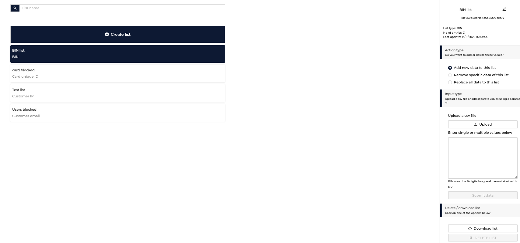- Flexible criteria - a list can include one of the following criteria: customer email addresses, card unique IDs, BINs, customer ID, customer IP, customer zip code, product SKU.
