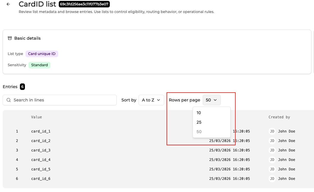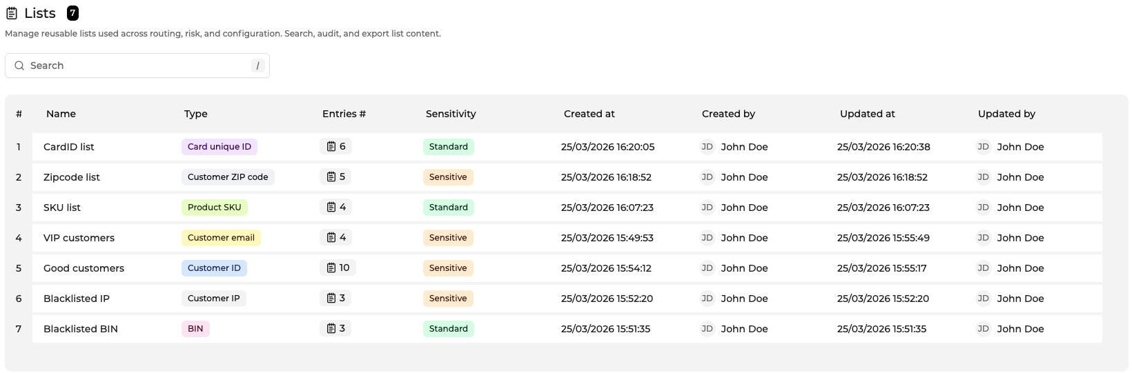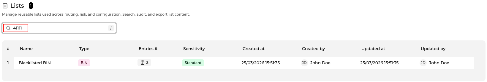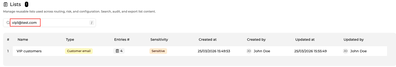 NOTA: Entry values are not displayed in the Lists table. However, the search function also matches entry values contained in lists. If a searched value exists inside a list, the corresponding list will appear in the results. The entry value itself is never displayed in the table, only the list metadata is shown.