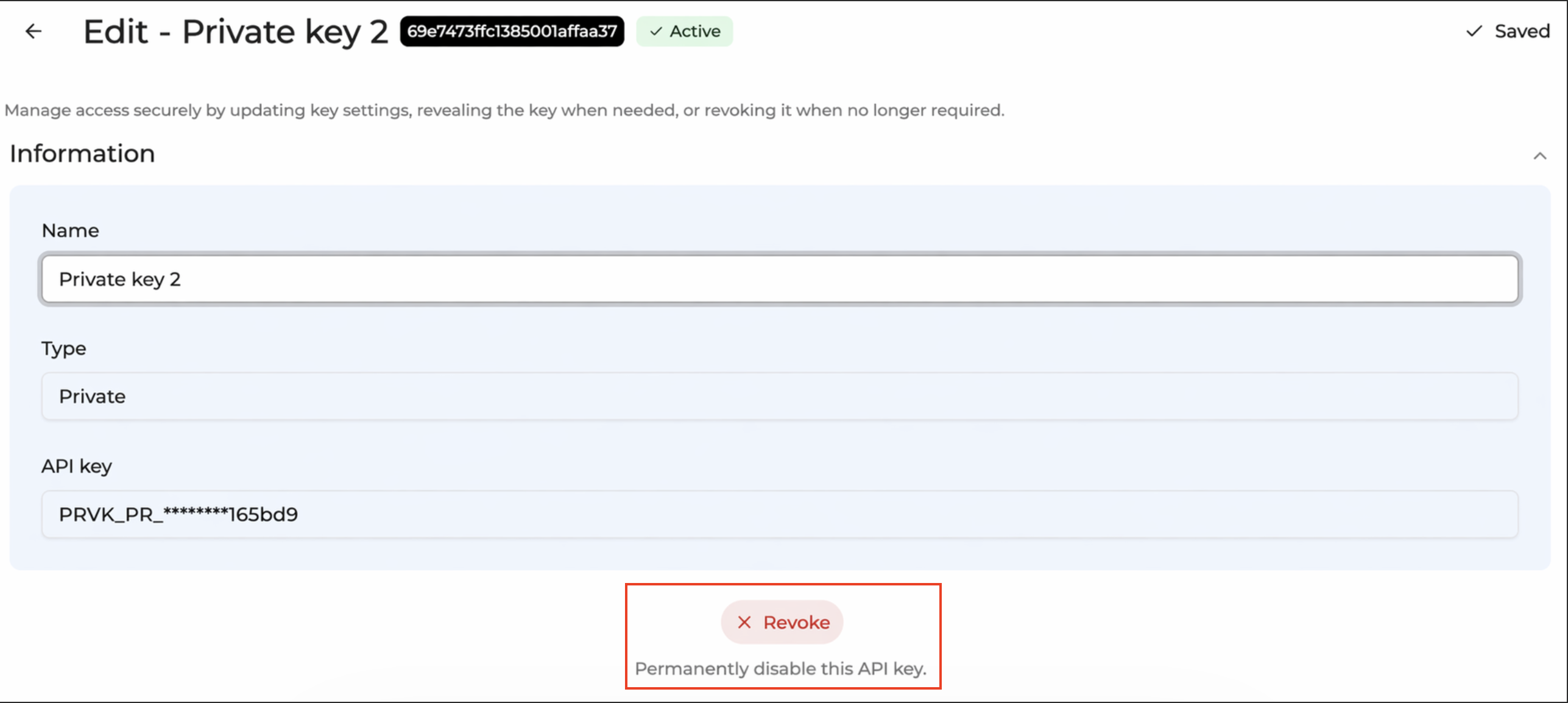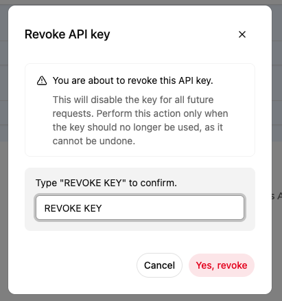 Revoking an API key permanently disables it.