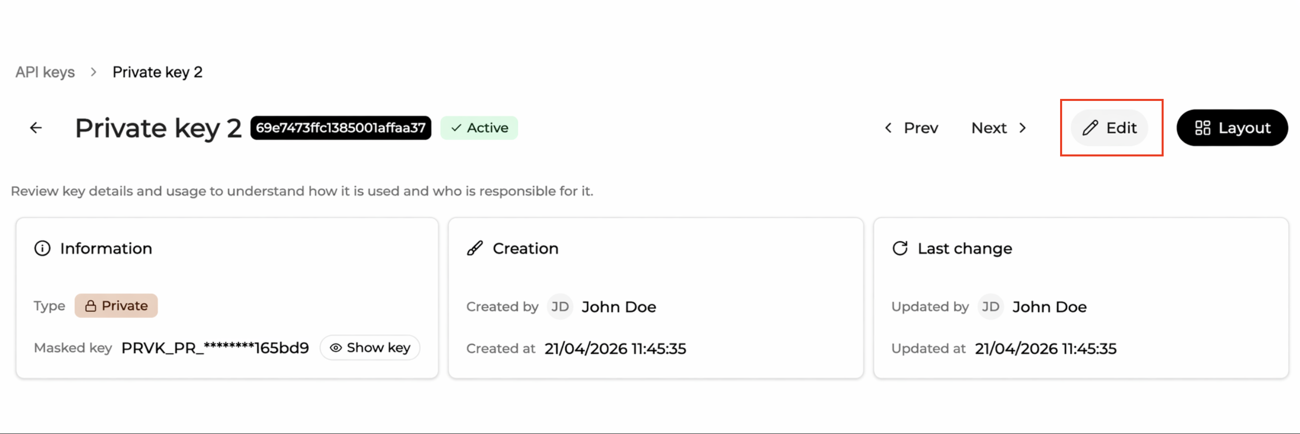 - the key value is masked by default and can be revealed securely at any time. Each reveal is logged for audit purposes.