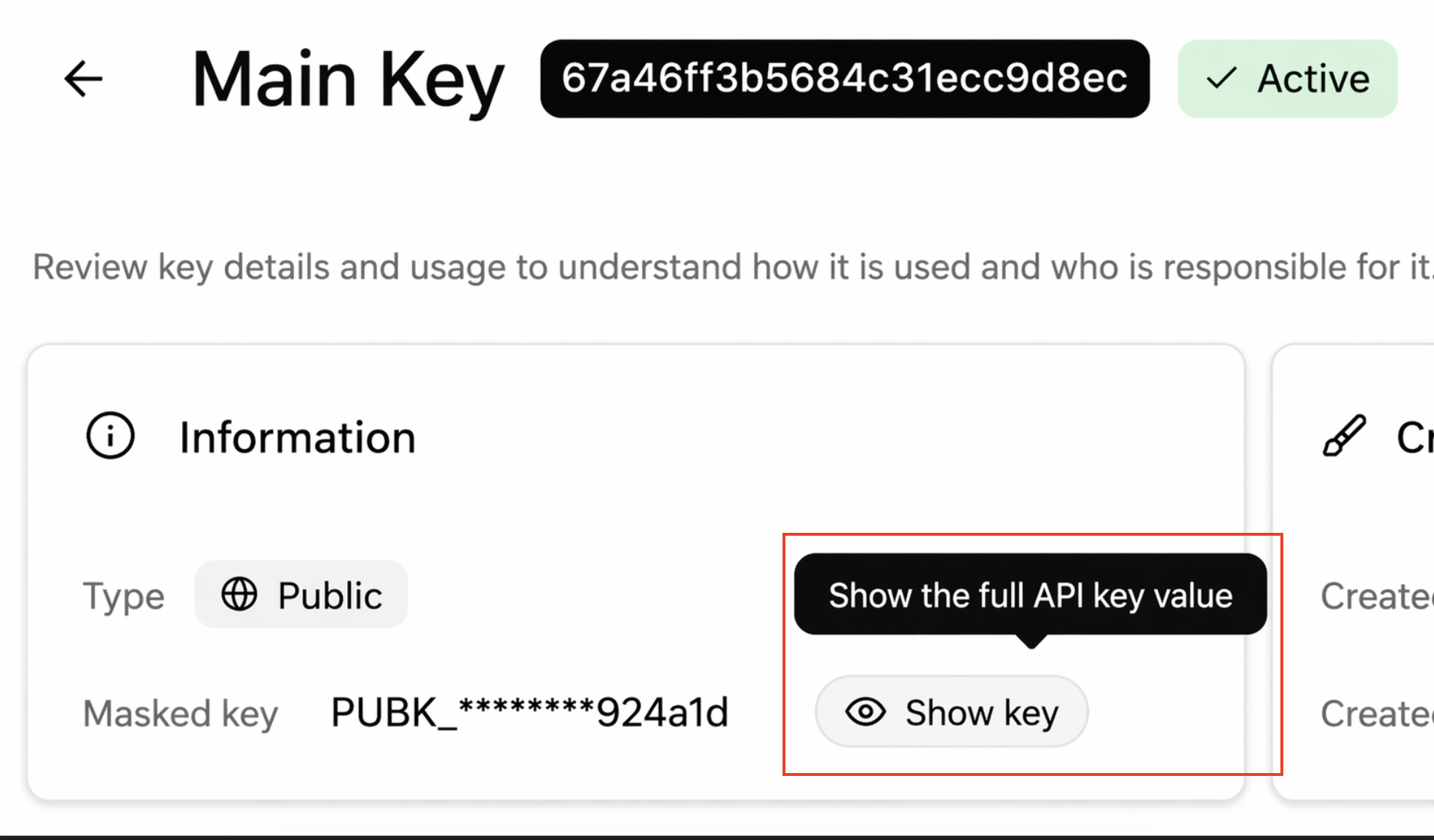 - Users can reveal the full key via a dedicated action