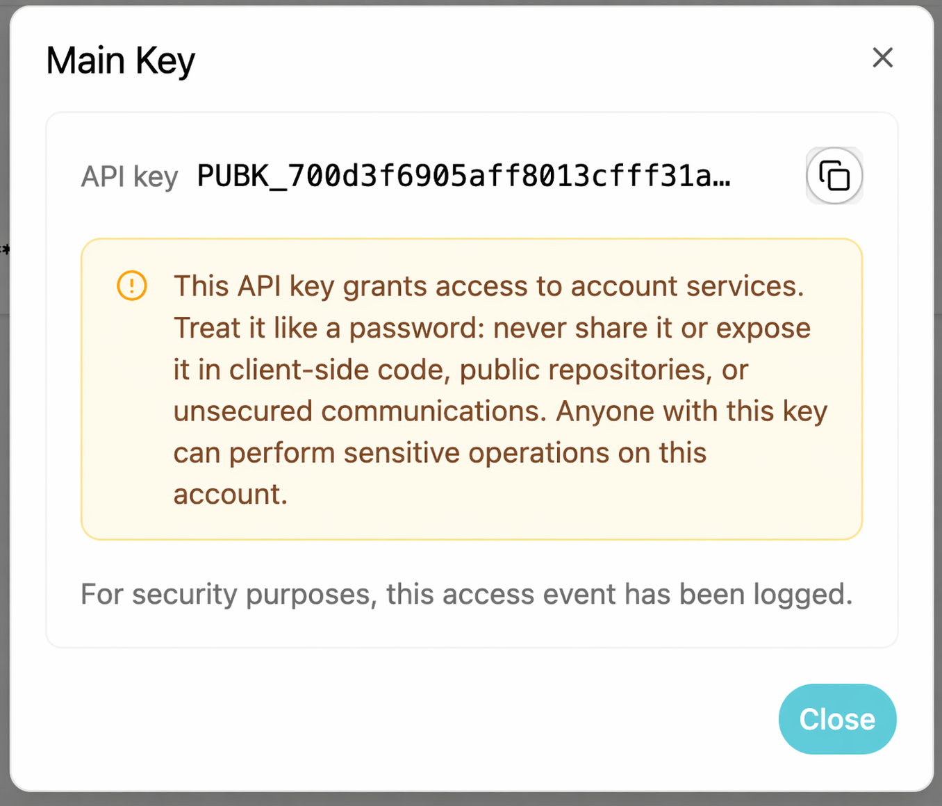 - A warning is displayed before copying the key