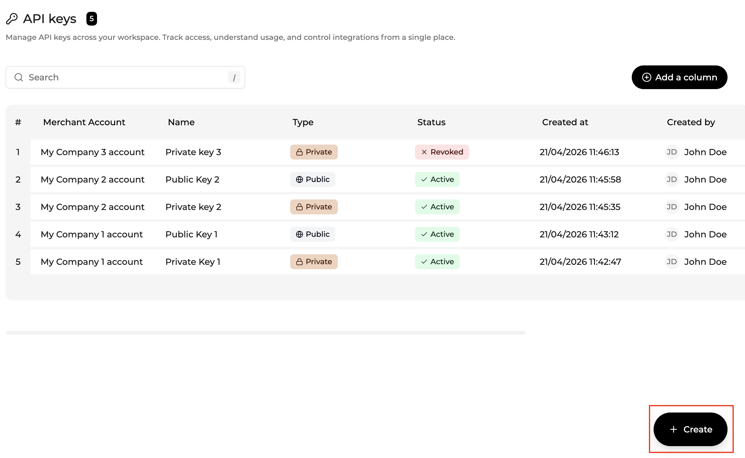 Revoked keys remain visible for audit purposes.