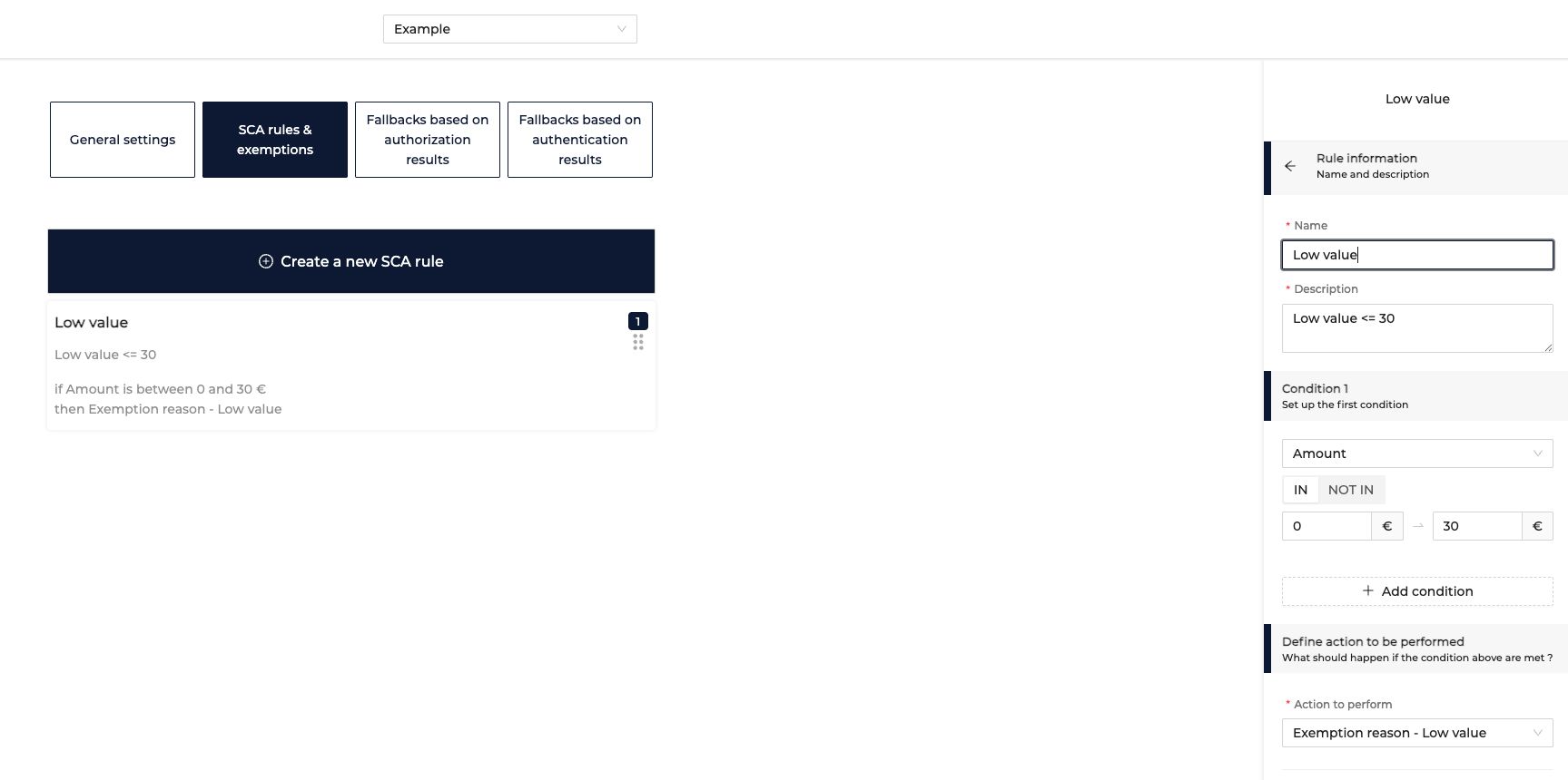 Set rule condition(s): amount, card country, customer ID, customer IP country, customer email, card unique ID, Issuer, product type, scheme, store id