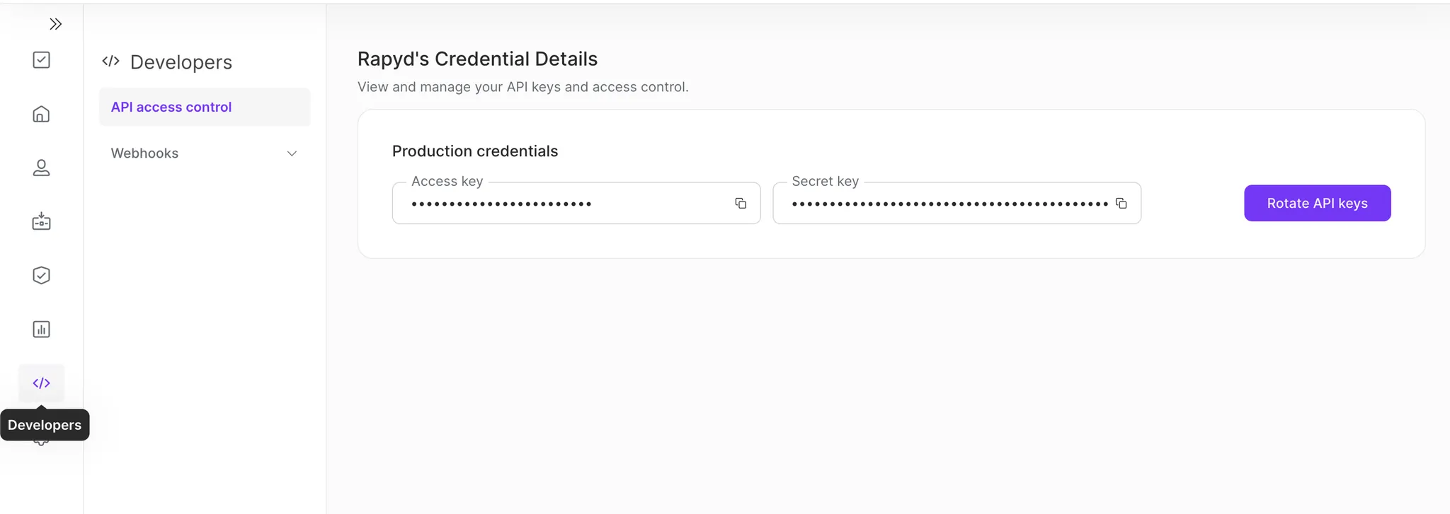 Connect to the interface https://dashboard.rapyd.net/ and go to Developer section from the side bar where you find Access key and Secret key under the API access control.