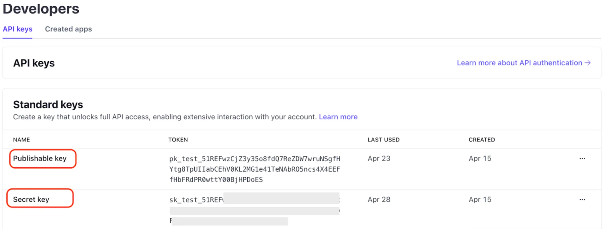 - Visit the following link: https://dashboard.stripe.com/apikeys or navigate do Developers → API keys.
