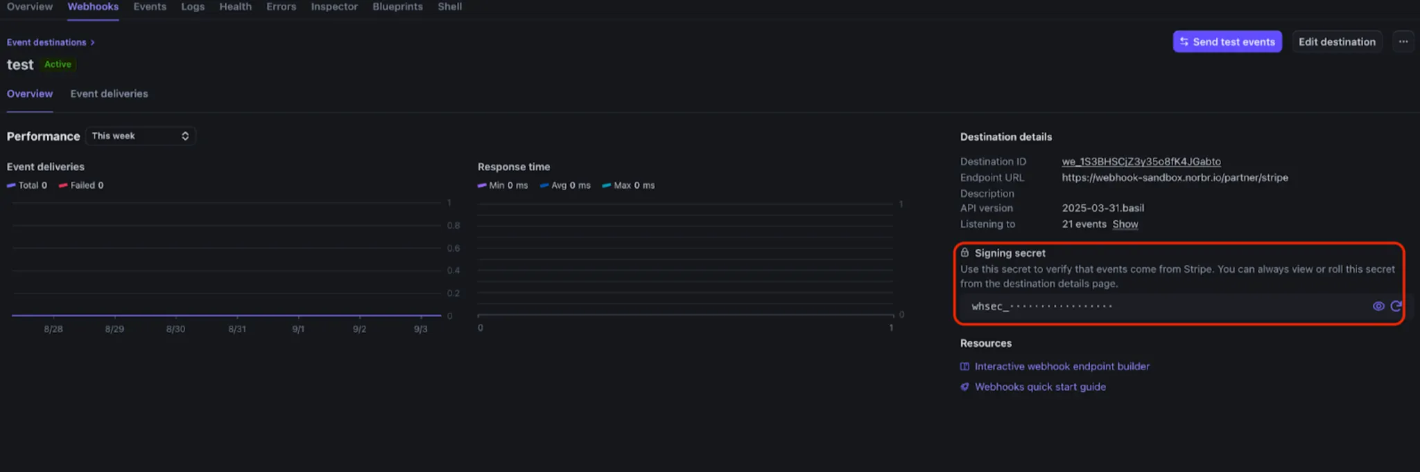 Endpoint URL: Sandbox : https://webhook-sandbox.norbr.io/partner/stripe Production : https://webhook.norbr.io/partner/stripe