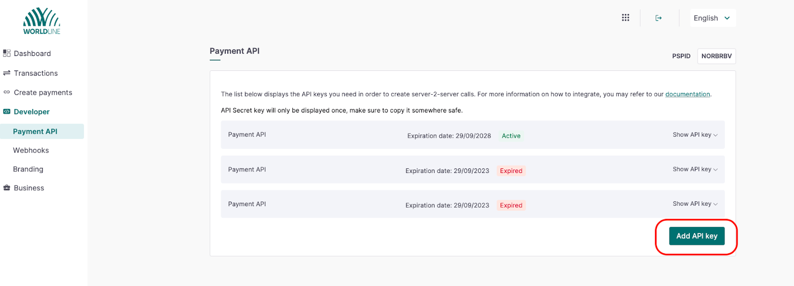 NB : the secret is shown only once when you click on Add API Key so make sure to store it right away, otherwise the key itself is shown here by clicking on “Show API Key” :